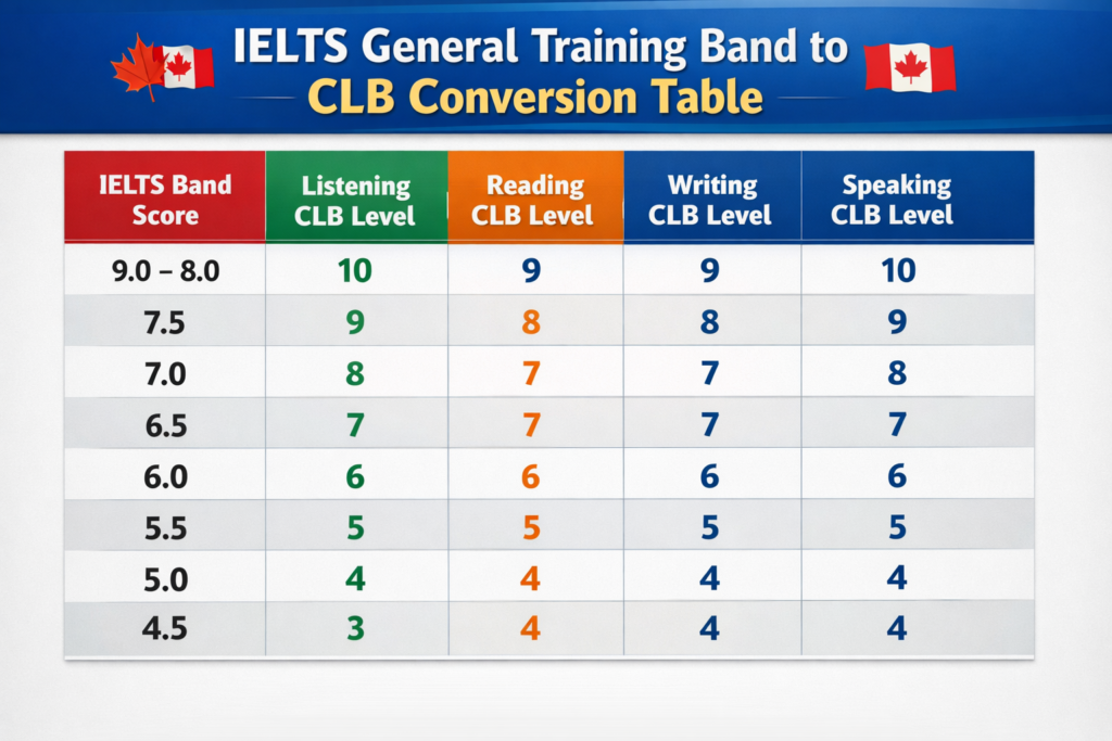 Important: These conversions apply to IELTS General Training only. IELTS Academic uses different scoring criteria and is not accepted for Express Entry.